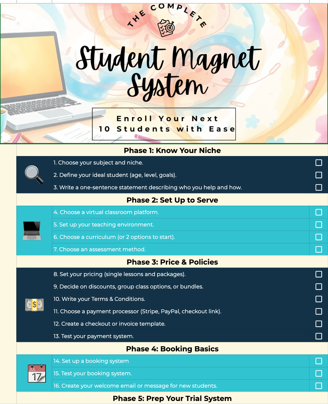 The Student Magnet System is a free checklist that shows you exactly what steps to take—and in what order—to enroll your first 10 independent students confidently and quickly.